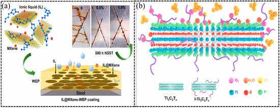 (a) Schematic illustration of IL@MXene nanosheets structure, corrosion mechanism of the neat WEP, the IL@MXene/WEP composite coating, and digital photographs of steels protected by different coatings after NSST for 500 h [98]. Reprinted with permission from [98], copyright 2021, American Chemical Society. (b) Schematic representation of the corrosion process with I-Ti3C2Tx contained in epoxy resin [99]. Reprinted with permission from [99], copyright 2023 Elsevier.