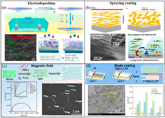 The comparison of the above-discussed methods to obtain highly oriented Ti3C2Tx MXenes NSs in EP composite coatings is listed in Table 3. Each method has advantages and weaknesses. Thus, a strategy to produce highly aligned MXene 2D NSs in composite coatings economically, reliably, and suitable for large-scale preparation is still desired.