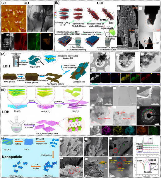 Heterogeneous composite materials formed between multiple NMs and MXenes [4]. Reprinted with permission from [4], copyright 2024 Elsevier. (a) AFM and TEM images of GO-Ti3C2Tx NSs, including the HAADF image and EDS mapping of GO-Ti3C2Tx [110]. Reprinted with permission from [110], copyright 2023 Elsevier. (b) Schematic illustration of the fabrication process of COF-modified MXene, including FE-SEM and TEM images of synthesized MXene [128]. Reprinted with permission from [128], copyright 2023 Elsevier. (c) Synthesis process of Ti3C2Tx@MgAl-LDH by the hydrothermal method, including the SEM and TEM images and EDS elemental mappings of the Ti3C2Tx@MgAl-LDH [115]. Reprinted with permission from [115], copyright 2023 Elsevier. (d) The co-deposition of Ti3C2Tx MXene@MgAl-LDH heterostructure, including SEM, HRTEM images, SAED pattern, and EDS mapping of Ti3C2Tx MXene@MgAl-LDH [114]. Reprinted with permission from [114], copyright 2021 Elsevier. (e) Preparation process of MXene modified by the TiN/TiO2 nanoparticles, including the SEM and TEM images of the modified MXene nanosheets, XRD patterns, and polarization curve of the samples [121]. Reprinted with permission from [121], copyright 2022 Elsevier.