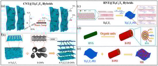 Herein, this section is arranged based on the hybridization between MXene and the following NMs: (i) Carbon-based NMs, (ii) LDH, (iii) 0D NPs, (iv) 1D NMs (CNT, CNF), and (v) other 2D NMs, such as h-BN, MoS2, and covalent organic frameworks (COFs) [128] or MOF. Some typical heterogeneous composites formed between multiple NMs and MXenes are shown in Figure 10 [4].