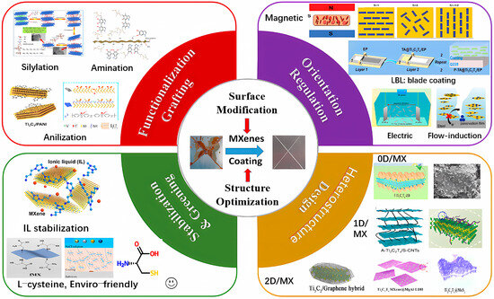 Owing to the rich reactive surface groups, silane coupling agents have been widely adopted as grafting agents to improve interfacial binding. Surface silanization reaction is beneficial to inhibit its structural degradation, thus effectively stabilizing the MXene and enhancing the surface properties with adjustable hydrophilicity [73,74,75,76,77,78,79,80,81,82,83].