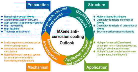In contrast, MXenes (2D transition metal carbides/nitrides) have abundant surface chemical terminal groups, which easily form bonds with other materials or undergo surface modification or functionalization to improve the corrosion resistance of organic coatings [26,27,28,29,30]. Therefore, MXenes have attracted widespread attention in recent years [31,32,33,34,35,36]. For example, in 2019, H. Yan et al. first introduced an MXene (Ti3C2Tx) in the field of corrosion prevention [30]. Subsequently, research on new organic anticorrosion coatings based on MXenes has grown rapidly. However, actual MXenes may have many structural defects, and the characteristics of easy stacking, good conductivity, and proneness to oxidation are adverse to corrosion protection. Therefore, there is controversy about whether MXenes can be applied for corrosion protection or not. Thus, a few basic questions need to be answered, such as: if it can be applied, what are its advantages and disadvantages? How can it be used appropriately? Is there any special attention essential? Therefore, it is necessary to summarize and analyze the characteristics, performance, and development trends of MXene-based anticorrosion coatings.