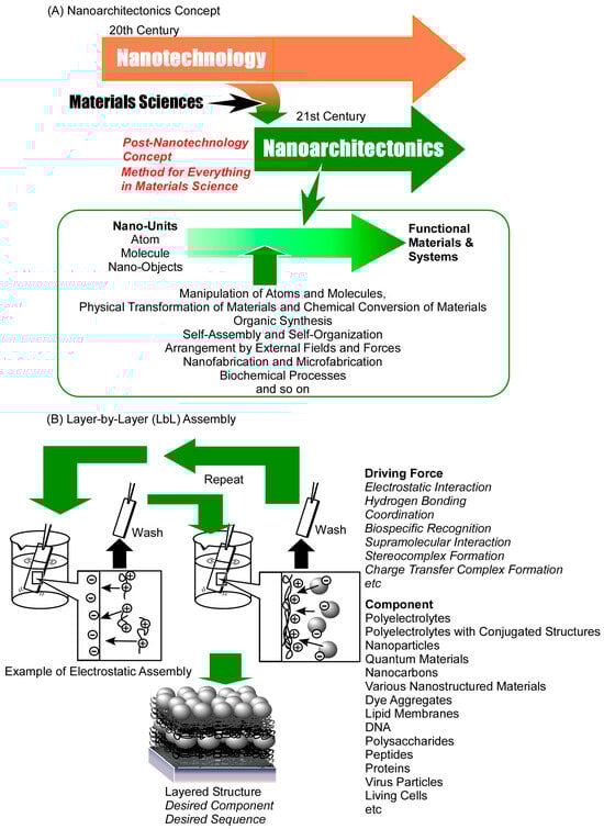 Outline of layer-by-layer nanoarchitectonics: (A) history and basic strategy of nanoarchitectonics; (B) typical assembling methods and varieties of components and driving forces.
