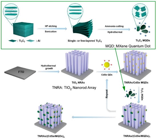 An electrostatic LbL assembly approach of oppositely charged transition metal chalcogenide quantum dot and MXene quantum dots in a metal oxide framework on TiO2 nanorod arrays. Reprinted with permission from [251]. Copyright 2024 Wiley-VCH.