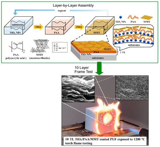 A flame retardant system of titanium dioxide (TiO2), montmorillonite (MMT), and poly(acrylic acid) (PAA) fabricated by LbL assembly: assembling method (top) and internal structures and flame retardant (bottom). Reprinted with permission from [258]. Copyright 2024 American Chemical Society.