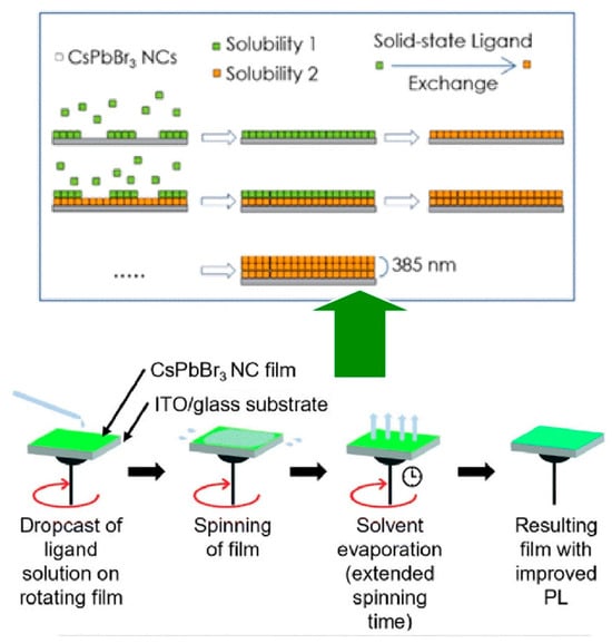 Nanocrystals, defined as nano-objects with well-defined structures and crystal systems, represent attractive research targets for the development of advanced functions [259,260,261,262]. In particular, the thickness of nanocrystal films is a critical factor in the functionality of light-emitting diodes (LEDs), solar cells, and lasers. For instance, in the context of light-emitting diodes, the thickness of the light-emitting material film plays a pivotal role in determining the efficiency of the injected charge, which is crucial for the generation of bright electroluminescence. A similar relationship exists in solar cells, where the performance is determined by the amount of light absorbed, that is, the quantity of light absorbers within the device. Consequently, there is considerable value in exploring the layer-by-layer nanoarchitectonics of nanocrystals, using techniques such as LbL assembly, with respect to functionality development [263,264]. A notable example was reported by Francesco Di Stasio and his colleagues, who have demonstrated the LbL assembly method to produce high-quality films with finely controlled thickness using nanocrystals [265]. The possibility of ligand substitution in a solution of CsPbX3 (X = Cl, Br, or I) nanocrystals was exploited. Figure 4 demonstrates the solid-state ligand exchange of perovskite nanocrystal films, followed by layer-by-layer nanoarchitectonics by spin coating. The photoluminescence quantum yield values of CsPbBr3 nanocrystal films were enhanced by the introduction of didodecyldimethylammonium bromide and ammonium thiocyanate as new ligands on the nanocrystal surface. The deposition of the CsPbBr3 nanocrystal concentrated solution was performed in static mode on a spin coater, followed by spinning. This dynamic treatment can be achieved by depositing the ligand solution onto a rotating substrate and allowing it to move for an extended period. It was observed that the film thickness increases with increasing deposition times, and homogeneous films with thicknesses reaching 385 nm can be fabricated. It is further hypothesized that the facile LbL composite process of this method can be applied to other perovskite nanomaterials, thereby enabling layer-by-layer nanoarchitectonics of various layer combinations.
