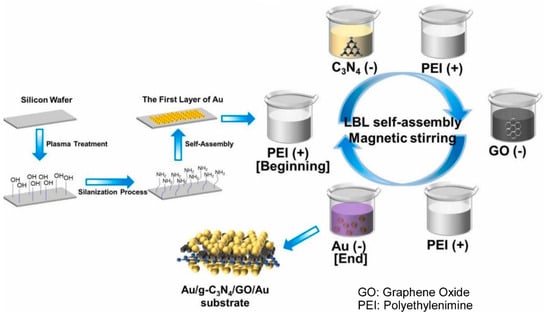 Fabrication of Au/g-C3N4/GO/Au hybrid nanofilms by LbL assembly using nanosheet-structured graphitic carbonitride (g-C3N4), graphene oxide (GO), and 40 nm gold nanoparticles (Au NPs). Reprinted with permission from [291]. Copyright 2024 Elsevier.