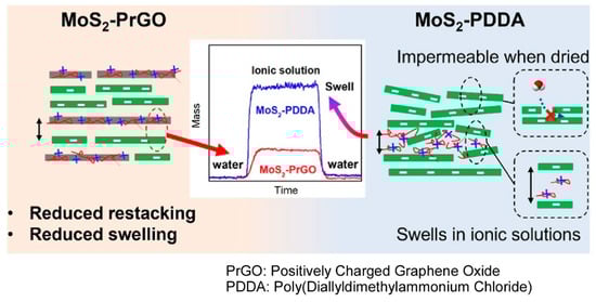 A plethora of other 2D materials have been the subject of study in the context of nanosheets [292,293,294], and such nanosheets have also been identified as attractive targets for LbL assembly [295,296]. The process of the LbL assembly of oppositely charged materials frequently gives rise to the creation of electrically stabilized nanosheet–polymer structures. In contrast, Mi and co-workers have proposed that the use of 2D nanosheets with matching physical properties to both polyanions and polycations may lead to more ordered nanostructures, with better stability than nanosheet–polymer structures [297]. In order to draw parallels between nanosheet–nanosheet and nanosheet–polymer structures, negatively charged molybdenum disulfide nanosheets (MoS2) were LbL-assembled with either positively charged graphene oxide (PrGO) nanosheets or a positively charged polymer (poly(diallyldimethylammonium chloride), PDDA) (Figure 8). The assembly of PrGO, a nanosheet-based polycation, resulted in a significantly more aligned structure with MoS2 nanosheets, owing to the similarity in shape, size, and charge density. The restacking of MoS2 upon drying was more effectively controlled by positively charged graphene oxide compared to positively charged polymers. Consequently, MoS2-PrGO membranes exhibited enhanced stability under high ionic strength conditions and facilitated higher water flux with superior size exclusion. Specifically, the membranes composed of nanosheets with matching size, shape, and charge density exhibited a more aligned stacking structure, which reduced membrane swelling in high salt solutions, controlled restacking, and improved the separation performance. This exemplifies the pivotal role of compatibility among constituent materials in layer-by-layer nanoarchitectonics.