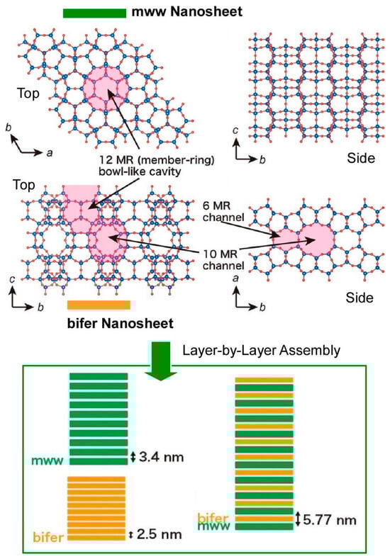 Electrostatic LbL assembly of two types of zeolite nanosheets with different porous structures, MWW topology (mww), and ferrierite-related structure (bifer) (Figure 9): zeolite structures (top) and possible LbL architectures (bottom). Reproduced under terms of the CC-BY license [301]. Copyright 2024 Wiley-VCH.