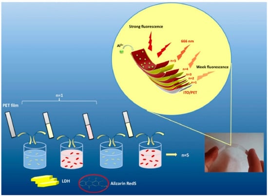 Investigations have been conducted on layered materials, such as layered double hydroxide (LDH) [316,317], in view of their diverse functionalities, including dye intercalation. For example, the development of an Al3+ detection sensor by LbL assembly of LDH and dyes has been reported by Rouhani and co-workers (Figure 12) [318]. Despite the fact that toxic Al3+ ions have serious effects on the human nervous system, such as those related to Alzheimer’s disease, the development of solid electrodes for sensor-based Al3+ detection is not necessarily sufficient. In this study, electrochemical solid-state sensors based on flexible ITO-coated polyethylene terephthalate (PET) substrates were designed and constructed. The sensing element consists of Mg–Al LDH nanoplatelets and Alizarin Red S (ARS), fabricated by LbL assembly. ARS, an electroactive organic unit present in the layered (ARS/LDHs)n matrix, can detect the electrochemical changes of the Al chelating system when exposed to the target Al3+. The LbL sensor exhibits high sensitivity and selectivity in detecting Al3+ through both electrochemical and optical methods, thereby combining the characteristics of cyclic voltammetry and fluorescence-based optical methods. This system has the potential to serve as a methodology for biotechnological diagnostics.