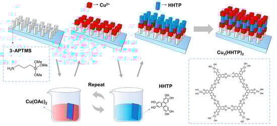 Fabrication of d Cu3(HHTP)2 MOF thin films of controllable thickness on conductive fluorine-doped tin oxide (FTO) glass surfaces by LbL assembly. Reprinted with permission from [327]. Copyright 2021 Elsevier.