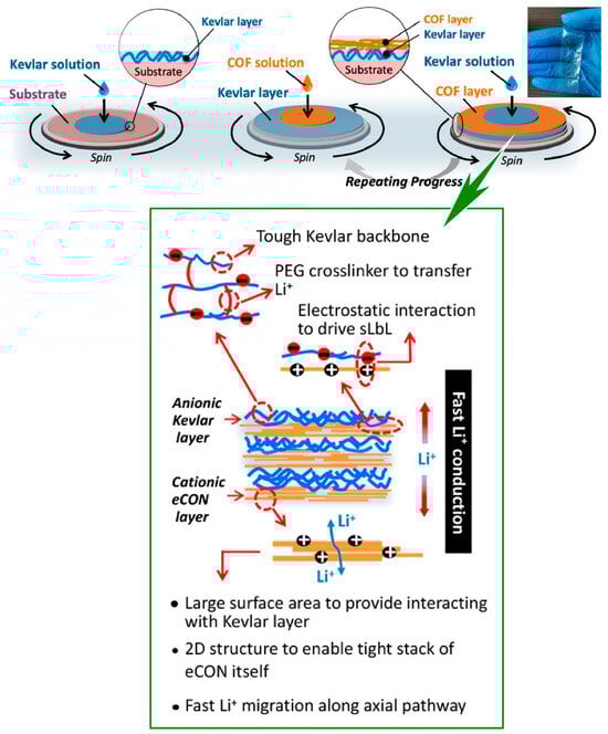 Covalent organic frameworks (COFs), which are composed of organic units linked through covalent bonds to form porous structures, have also garnered significant interest [328,329,330]. The synthesis of multilayered COF structures has been reported [331,332], with particular attention being directed towards their potential applications in the energy sector. Specifically, there is a significant demand for lightweight membranes with a thickness of less than tens of microns, with the objective of maximizing the energy density of solid-state batteries for next-generation lithium-based batteries. Lu, Chen, and their colleagues have developed a heterolayered Kevlar/COF composite membrane through a bottom-up spin LbL assembly technique, which enables precise control over the membrane structure and thickness (Figure 14) [333]. The unitized membrane was fabricated by means of spinning LbL assembly and was molded to a precisely controlled thickness. The Kevlar component provides structural advantages in terms of mechanical strength, and the layered 2D COF sheets provide fast Li+ conductivity and can be tightly interlocked with Kevlar through electrostatic interactions. The synthesis of a robust and Li+-conductive electrolyte film was enabled by the significantly enhanced chemical/mechanical interactions between the crosslinked Kevlar and the conductive 2D–COF components. Furthermore, the fast directional diffusion of Li+ was achieved locally along the channel direction, perpendicular to the assembled 2D COFs, which function as excellent ionic conductors and facilitate the release of free Li+ species. Through the LbL assembly of COFs, this study proposes a novel concept of an ultrathin, ultrastrong, and conductive solid composite electrolyte based on heterolayer architecture for highly safe solid-state lithium metal batteries. The development of such multifunctional membranes through layer-by-layer nanoarchitectonics paves the way for the development of high energy density solid-state lithium metal batteries in the future.