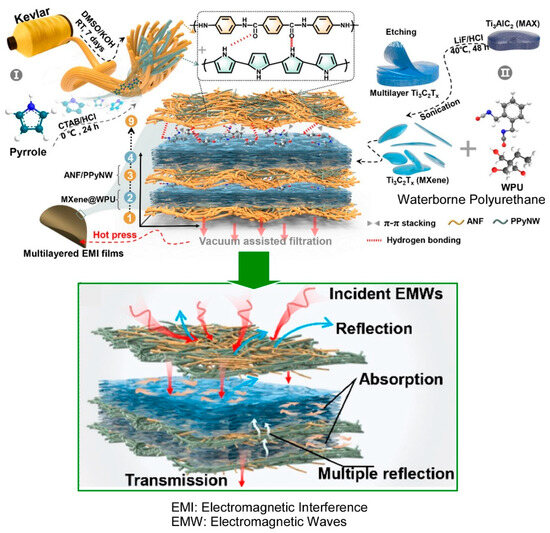 Fabrication of a flexible multilayer electromagnetic shielding and interference shielding composite film based on alternately layering with aramid nanofibers/polypyrrole nanowires and Ti3C2Tx reinforced with water-based polyurethane: film construction (top) and representative properties (bottom). Reprinted with permission from [343]. Copyright 2022 Elsevier.