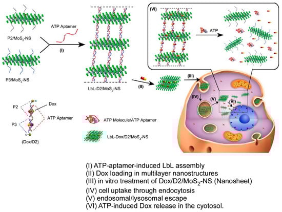 A system in which LbL self-assembled layered MoS2 superstructures carrying anticancer drugs with the property of autonomously disassembling in response to the enhanced ATP metabolism of cancer cells. Reprinted with permission from [350]. Copyright 2017 American Chemical Society.