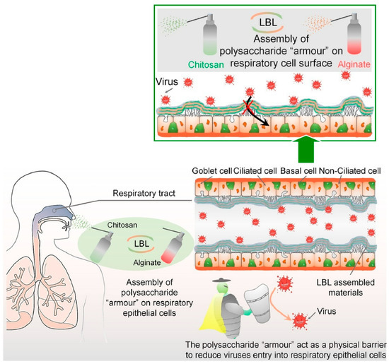 A nasal spray method to form a polysaccharide armor on the cell surface by spray-based LbL assembly method to minimize the risk of viral infection using positively charged chitosan and negatively charged alginate. Reprinted with permission from [355]. Copyright 2022 American Chemical Society.