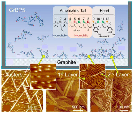 Self-assembly process of the initial two layers of graphite-bound dodecapeptide GrBP5 (graphite-binding peptide 5 (GrBP5)) on a highly oriented pyrolytic graphite surface in an aqueous solution through a series of molecular interactions, including conformational states, molecule–substrate interactions, and intermolecular interactions. Reprinted with permission from [363]. Copyright 2023 American Chemical Society.