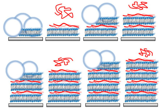 An LbL assembly using poly-L-lysine as an electrostatic polymer linker to form lipid multilayers on a supported lipid bilayer via lipid vesicle rupture, where positively charged poly-L-lysine is adsorbed onto a negatively charged base-supported lipid bilayer. Reproduced under terms of the CC-BY license [379]. Copyright 2016 American Chemical Society.