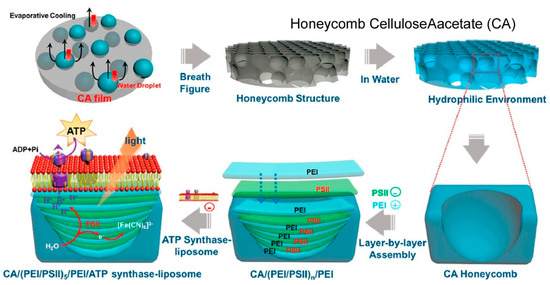 An artificially designed honeycomb multilayer structure for photophosphorylation by a multilayered photosystem II (PSII)-ATP synthase–liposome system through LbL assembly, where, under light irradiation, photosystem II splits water into protons, thereby generating a proton gradient that is utilized by ATP synthase to synthesize ATP. Reprinted with permission from [384]. Copyright 2018 American Chemical Society.