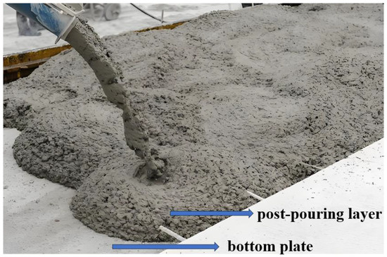 Currently, the choice of pouring materials is mostly recycled concrete and fiber-reinforced concrete [18,19]. Using recycled concrete pouring, the concrete strength is low, and the bottom plate can hardly meet the design requirements without prestressing [20]. It is necessary to increase the thickness of the web to improve the bending performance of the bottom plate and increase the production cost [21,22]. The research on incorporating fibers in fiber-reinforced concrete includes steel and carbon fibers [23,24,25,26]. The steel fiber-reinforced concrete has the advantages of improving concrete strength, reducing concrete cracks, and inhibiting crack extension, which can significantly improve the bending performance of the bottom plate. Previous scholars have applied it to slab members [18,19]. Studies have shown that steel fiber-reinforced concrete pouring can improve the bending performance, fatigue performance, fire resistance, and punching shear resistance of concrete slabs [27,28,29]. In this paper, high-strength steel fiber-reinforced concrete is used to improve the bending performance of the bottom plate. The amount of steel fiber-reinforced concrete is reduced as much as possible, and the goal of lowering support or even free support during construction is achieved.