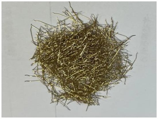 Four full-scale members were made in the test. The pouring materials, steel bars, web sizes, and flange sizes of the four composite slab bottom plates are the same. The pouring material of the composite slab floor is a kind of high-ductility concrete. The concrete is made of cement, fly ash, quartz sand, a water-reducing agent, water, and steel fiber (1% of the volume content) according to the specific ratio, and its designed compressive strength is C60. The steel fiber used is a hook-shaped copper-plated steel fiber with a length of 17 mm and a diameter of 0.44 mm. The specific picture is shown in Figure 4. The standard-size test blocks required for the mechanical properties test of concrete were poured at the same time. After curing, the mechanical properties test was conducted according to the requirements of the “Standard for Testing Methods of Mechanical and Physical Properties of Concrete” (GB/T50081-2019) [35]. The test results are listed in Table 1. Compared with CF60 steel fiber-reinforced concrete with steel fiber volume content of 1%, the cubic compressive strength, axial compressive strength, axial tensile strength, and elastic modulus of high-ductile concrete used in this paper increased by 15%, 18%, 25%, and 10%, respectively. Based on the mechanical properties of the concrete, the research purpose of free support in the construction of a non-prestressed composite slab floor is realized.