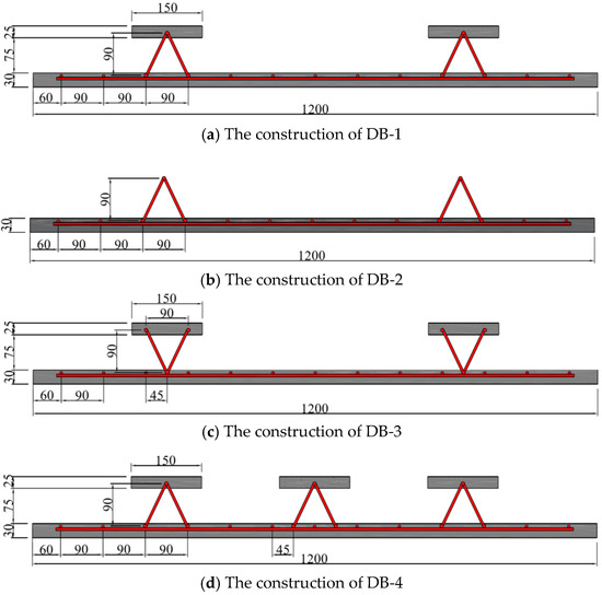 The web size of the four test bottom plates is 4.2 m × 1.2 m. The main difference is the rib plate structure of the bottom plate and the influence of different rib plate structures on the bending performance of the bottom plate designed in this paper. The web tensile steel bar and the structural steel bar are configured with the standard load combination during the use period after superposition. The details of each part of the steel bar configuration are shown in Table 2. The abdominal ribs are constructed as DB-1, and three contrast terms are established, which are defined as DB-2, DB-3, and DB-4, respectively. The schematic diagram of each plate structure is shown in Figure 5. The web structure and size diagram are shown in Figure 6. The difference between DB-2 and DB-1 rib plates is that the flange plate is canceled; the difference between DB-3 and DB-1 lies in the inverted truss binding; and DB-4 changed two ribs to three ribs on the rib structure of DB-1. The three comparison items explore the influence of the flange plate, truss-binding method, and number of ribs on the bending performance of the bottom plate of ribbed high-ductile concrete composite plate. The structural schematic diagram of each plate specimen is shown in Figure 2.