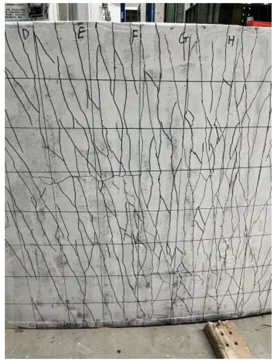 After each stage of loading, the loading time of the specimen is ensured to be longer than 15 min. After the specimen has been cracked, the cracks in the bottom plate are described, and the bearing value is marked at the end of the crack development. The marked bearing value depends on the time of crack occurrence, which can be divided into three certain situations: Cracks appear during the increase of load, during loading, and at the end of loading. For the three cases, the values are taken respectively: the pre-stage load value of this stage loading, the average value of this stage loading and the pre-stage load value, and the load value of this stage.