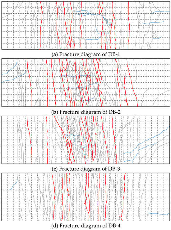 The crack labeling work of the four specimens was described, and the width was measured at the end of the loading time. During the test, a crisp sound is generated when new cracks are generated, and the friction sound is caused by the slip of steel fiber and concrete mixed. Because the test will produce minor cracks and cannot be recorded on the whole surface, the segmentation record is conducted according to the grid, and the electronic drawing is conducted in the later stage. Figure 12 shows the electronic drawing of the cracks of each specimen. Most of the cracks in the four specimens are composed of vertical penetrating cracks, “y”-type cracks, and transverse cracks, and the cracks contain steel fibers connecting the concrete on both sides and slipping from the concrete. The concrete steel fiber on both sides of the connection crack is stretched due to the bonding force with the concrete, and the end of the slipped steel fiber is curved.