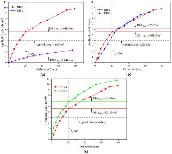 Load-mid-span deflection curve diagram. (a) The curves of DB-1 and DB-2; (b) The curves of DB-1 and DB-3; (c) The curves of DB-1 and DB-4.