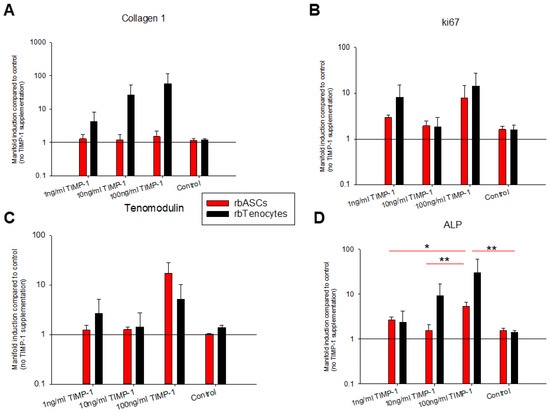 RbASC (red) and rbTenocyte (black) gene expression as mean ± standard error of the mean obtained from three donors for Col1A1 (A), ki67 (B), tenomodulin (C), and alkaline phosphatase ALP (D) under the TIMP-1 supplementation of 1, 10, or 100 ng/mL or without TIMP-1 (control). Key: using a Kruskal–Wallis test, the mean of 3 donors was calculated per condition, and inter-group significant difference was attributed to p ≤ 0.05 (*) and p ≤ 0.01 (**), respectively.