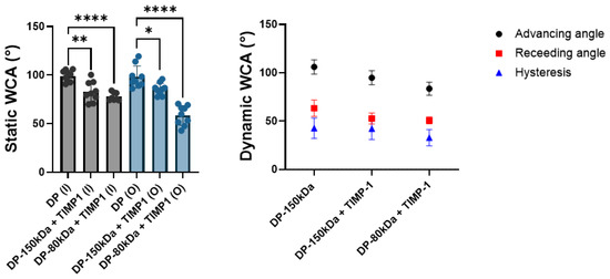 The static and dynamic water contact angles were assessed for pristine 150 kDa DP and for two emulsion electrospun DP meshes containing TIMP-1 in either 150 kDa or 80 kDa DP tubes, respectively (Figure 4). As expected, for the water-in-oil emulsion electrospun meshes, the contact angles were lower, indicating a more hydrophilic surface than for the pure DP fibers. This hydrophilic nature of emulsion electrospun meshes was even more prominent for the 80 kDa DP/TIMP-1 meshes compared with the 150 kDa DP/TIMP-1 meshes. The same was found for the dynamic WCA, with lower advancing and receding WCA for the emulsion electrospun meshes compared with the pure DP meshes, and lower angles for the 80 kDa compared with the 150 kDa DP/TIMP-1 fibers.
