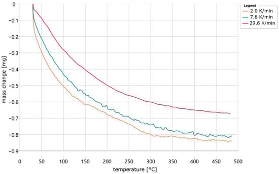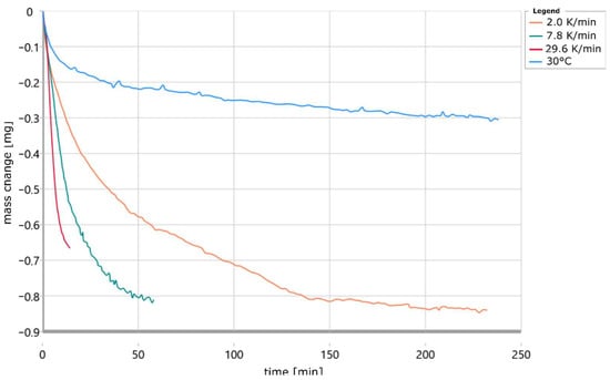 The measurement curve of the isothermal measurement at 30 °C is also shown here. This shows a similar mass loss at the beginning of the measurement as the other measurements and thus confirms the assumption that part of the binder in the sample has already been cured before the start of the experiment. In addition, a slope of large magnitude is also evident at the end of the mass change curve for the sample heated at 30 K/min. This suggests that the sample is not completely cured at the end of the measurement time. This is because a reaction would be complete when the slope of the mass change curve changes little at the end of the measurement and the mass loss is small. This can be seen well in the case of the specimen heated at 8 K/min, where the mass change decreases successively and this is small at the end of the measurement.