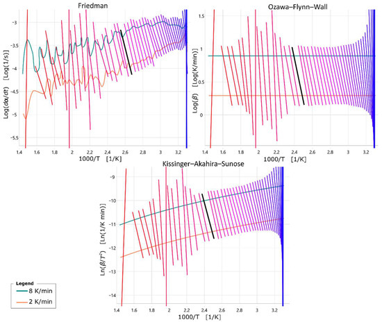 Figure 8, straight lines running through the points of constant conversion have been drawn, whose colour runs from blue to red with increasing conversion. In addition, a black straight line is drawn, which marks a conversion degree of 66%. It can be seen that the Ozawa–Flynn–Wall and Kissinger–Akahira–Sunose methods yield similar straight line curves. The activation energy is related to the slope of the straight lines drawn in
