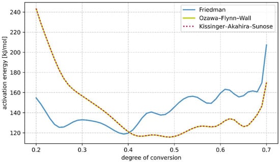 Figure 8, the activation energy calculated with the Ozawa–Flynn–Wall and the Kissinger–Akahira–Sunose methods is almost identical. With the Friedman method, in the range from a theoretical conversion of 0.37 to 0.65, taking into account some fuzziness due to the incomplete measurement results described earlier, the average activation energy is 144.18 kJ/mol. Using the Ozawa–Flynn–Wall method, a value of 123.36 kJ/mol can be determined in the same range, and using the Kissinger–Akahira–Sunose method, a value of 123.31 kJ/mol. The so-determined activation energy can now also help in a model-based approach to determine the kinetic model to select the appropriate reaction model.