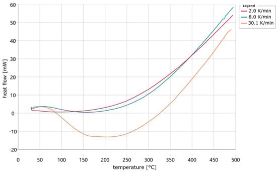 12]. To determine the transformation process and subsequently a kinetic model, baselines would first have to be generated that delimit the heat generated by the reaction. However, this is very difficult because, depending on the heating rate, no clear areas can be defined in which the heat flow is not influenced by the heat of the reaction. In addition, it would be wrong to create a baseline at the start of the measurement, as it was clear from the TG curves that a hardening reaction of the water glass solution was already taking place at the start of the measurement. Therefore, no kinetic model can be created from the heat flow signals. However, it is likely that the curing is an exothermic reaction, as at higher heating rates the filled sample crucible absorbs less heat than the empty crucible. Although this information does not affect the kinetic model, this was not previously known from the existing literature. The largest decrease in the curves measured at a heating rate of 8 and 30 K/min may be related to the boiling point of water, which is 100 °C.