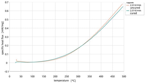 Figure 11 shows the difference in heat flow for an uncured and an already cured sample at a heating rate of 2 K/min. In contrast to the previous figures, the heat flow here is plotted relative to the weight of the samples. It can be seen that the two curves are very similar. In the range of 100–310 °C, the heat flow absorbed by the already cured sample is greater than that absorbed by the uncured sample. After that, this changes and the uncured sample absorbs a greater heat flow. The similarity of the two curves makes it clear how difficult it is to find a suitable point at which to apply the baseline, as the curves change only slightly due to the heat of the reaction. Further or renewed curing of the already cured sample could be ruled out by the simultaneously recorded TG curve, as no weight loss occurred in this case. Here, the heat flows of the uncured and cured samples differ more clearly. However, it is still not possible to develop a suitable baseline.