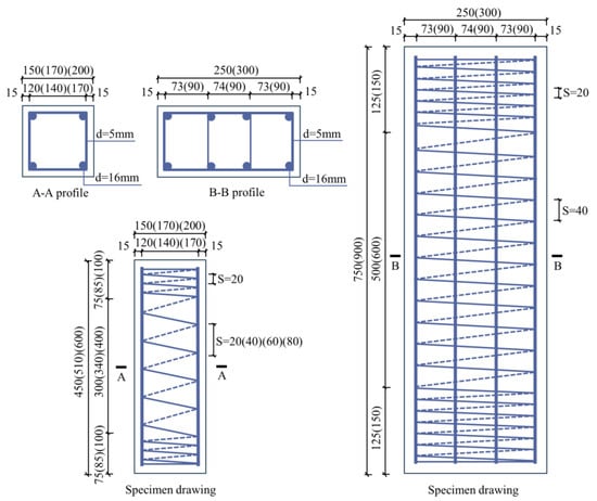 Monotonic axial compression tests were conducted on 16 steel fiber-reinforced concrete columns confined by high-strength rectangular spiral stirrups, as presented in this study. The main design parameters of the specimens, including section size, concrete strength, stirrup strength, and stirrup spacing, are listed in Table 1. The thickness of the column protective layer is 15 mm, with a stirrup-encrypted zone featuring a 20 mm spacing at 1/6 of the end to prevent local damage. The middle two-thirds of each specimen was used for testing. The reinforcement and cross-section details of the specimens are shown in Figure 1.