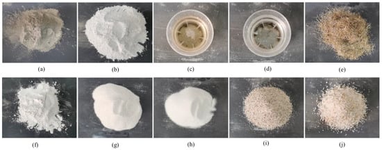 Raw materials used in SFRC. (a) P.O 42.5R cement; (b) silica fume; (c) water reducing agent; (d) defoamer; (e) steel fiber; (f) 325 mesh quartz sand; (g) 70–140 mesh quartz sand; (h) 40–70 mesh quartz sand; (i) 20–40 mesh quartz sand; (j) 10–20 mesh quartz sand.