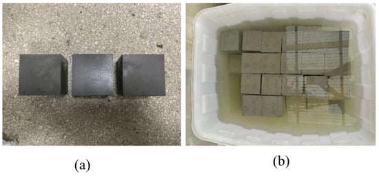 In the preparation of SFRC, P.O 42.5R ordinary Portland cement, silica ash (enhance the density, strength, and durability of concrete), polycarboxylic acid high-performance water reducer, cement gypsum antifoam agent, 14 mm copper-coated steel fiber, and quartz sand were selected, as shown in Figure 2. Quartz sand includes 10–20 mesh, 20–40 mesh, 40–70 mesh, 70–120 mesh, and 325 mesh five particle sizes, the mass ratio of 1.1:0.6:1.5:1.3:1.4. The design mix ratio is shown in Table 2. The steel fibers are copper-coated to enhance their corrosion resistance and crack resistance, with performance indicators shown in Table 3. As shown in Figure 3, Three standard cubic test blocks were poured for each grade of SFRC to measure the compressive strength (fcu) and obtain an average value. The results of basic mechanical properties are listed in Table 4.