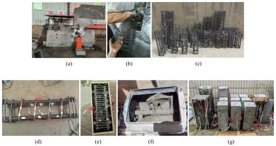 Specimen making. (a) Automatic hoop bending machine device; (b) spiral stirrup production; (c) steel cage making; (d) attach steel bar strain gauge; (e) support form; (f) concrete mixing; (g) specimen curing.