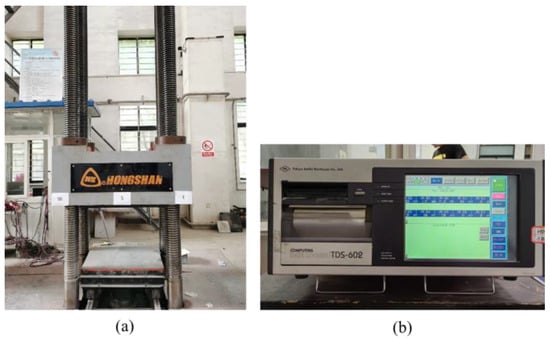 To ensure uniform load application, a thick layer of fine sand was placed at both the upper and lower ends of the specimen for leveling. During the formal loading process, displacement control mode was employed with a loading rate of 0.2 mm/min, which was maintained constant throughout the test. The loading was stopped when the axial load of the concrete column decreased to 65% of the peak load. During the test, the load values, as well as the readings from the strain gauges and displacement meters, were automatically collected using the TDS-602 static data acquisition system, as shown in Figure 5b.