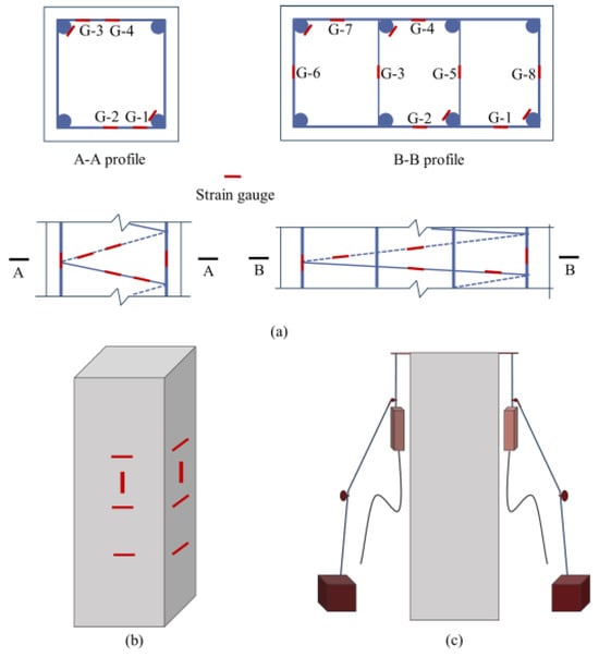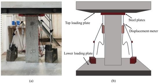 The main measurement parameters in the test include axial load, longitudinal and transverse displacement, as well as stirrup and longitudinal strain. As shown in Figure 6a, resistance strain gauges were affixed to the three coils of the spiral stirrup in the test section. Four strain gauges were placed on each loop of the rectangular stirrup, and eight strain gauges were attached to the rectangular composite stirrup, labeled G-1 to G-4 and G-1 to G-8, respectively. Resistance strain gauges were also pasted onto the diagonal longitudinal bars of the steel cage, with three strain gauges arranged on each bar, marked Z-1 to Z-3 from top to bottom. As shown in Figure 6b, one longitudinal strain gauge and three transverse strain gauges were positioned at the middle of each side of the specimen to measure axial strain and transverse strain at the section. Two displacement gauges were installed between the upper and lower pressure plates of the press, as shown in Figure 6c. A schematic diagram of the loading device is presented in Figure 7.