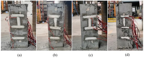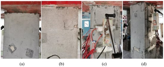 Failure phenomena of specimens C-1, C-6, C-7, and C-8. (a) C-1; (b) C-6; (c) C-7; (d) C-8.