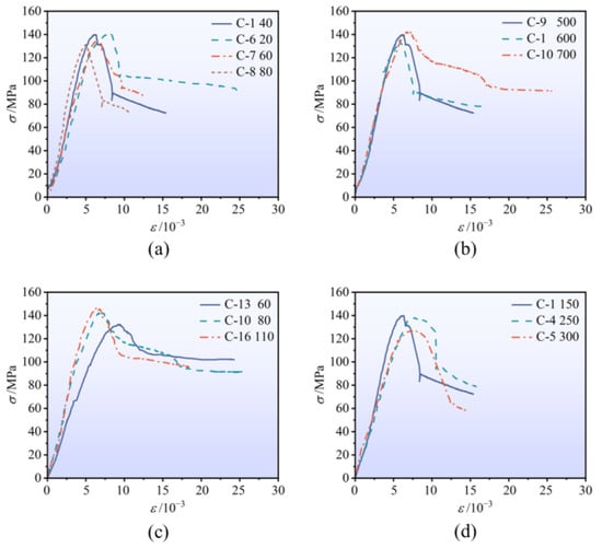 Comparison of stress–strain curves of specimens with different influencing factors. (a) Different stirrup spacing; (b) different stirrup strength; (c) different concrete strength; (d) different cross-sectional aspect ratio.
