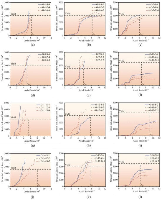 Measured strain curve of stirrup. (a) C-1; (b) C-6; (c) C-7; (d) C-8; (e) C-9; (f) C-10; (g) C-11; (h) C-12; (i) C-13; (j) C-14; (k) C-15; (l) C-16.