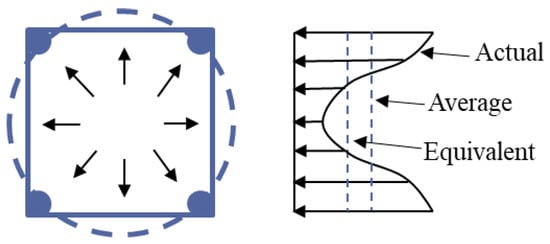 In a rectangular section, the core concrete expands laterally under pressure, and stirrups restrain it by applying a reaction force. However, due to the difference in the geometry and flexural stiffness of the stirrup along the section circumference, the binding force distribution is not uniform. At the corner of the stirrup, the bending stiffness is large, which can provide a strong lateral binding force. In the middle region of the stirrup edge, the flexural stiffness is low, and the binding force is significantly weakened, as shown in Figure 12. To simplify the calculation, it is assumed that the confining stress provided by the stirrup is uniformly distributed on all sides, and the average confining stress fl can be obtained according to the force balance equation as follows: