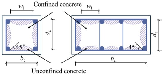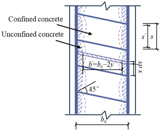 Due to the “arch effect”, the average lateral confinement stress only plays a full role in the effectively confined core concrete area shown in Figure 13 and Figure 14. Mander [9] modified the theory of effectively confined concrete in the core zone proposed by Sheikh and Uzumeri [26], redefined the concept of effectively confined core concrete area, and quantified the effective confined stress fl’ through the effective confinement coefficient ke. Then, the effective lateral confinement stress fl’ of the stirrup on the concrete in the core area is calculated as follows: