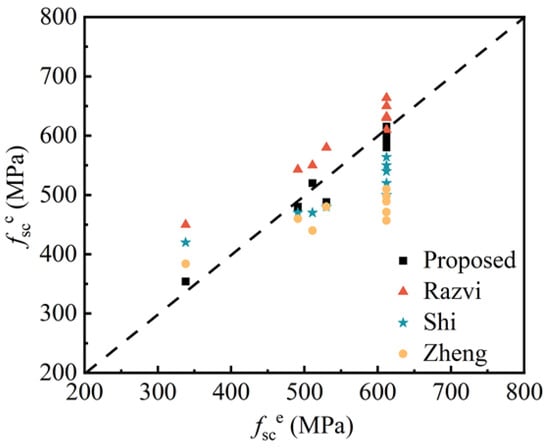 As shown in Table 7, the calculation formulas for stirrup tensile stress at peak compressive stress of confined concrete proposed by different scholars are listed. The comparison between the experimental stirrup stress fsce and the calculated stirrup stress fscc at peak bearing capacity for each specimen in the axial compression tests is shown in Figure 15, where fsce is taken as the maximum measured value from each stirrup measurement point. The comparison results indicate that the calculation values from the formula proposed by Razvi et al. [27] are consistently higher than the experimental values across different stirrup stress levels. The formula proposed by Shi et al. [28] overestimates the stirrup stress at low levels but underestimates it at high levels. The formula by Zheng et al. [29] yields good agreement with the experimental values at low stirrup stress, but the calculation values are lower than the experimental values at high stirrup stress. However, the calculation values from the fitting formula presented in this study match the experimental values better, more accurately reflecting the actual distribution of stirrup stress.