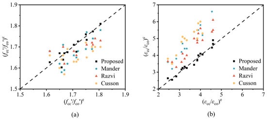 The peak stress and strain calculation models for confined concrete proposed by different scholars are listed in Table 8. Figure 16a,b shows the comparison analysis of the peak stress enhancement ratio (fcc/fc0)e and its calculated value (fcc/fc0)c, and the peak strain enhancement ratio (εcc/εc0)e and its calculated value (εcc/εc0)c, respectively. The points represent the relationship between the actual observed data of each specimen and the model’s predicted values. The comparison results indicate that the other models generally underestimate the peak stress of confined steel fiber reinforced concrete, overestimate the peak strain, and exhibit significant dispersion. In contrast, the peak stress and strain predicted by the model suggested in this study show a good agreement with the experimental values, accurately predicting the mechanical behavior of confined steel fiber reinforced concrete.