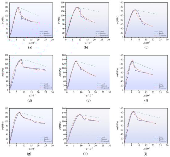 Comparison of stress–strain curves of typical specimens. (a) C-1; (b) C-4; (c) C-5; (d) C-6; (e) C-7; (f) C-9; (g) C-10; (h) C-13; (i) C-16.