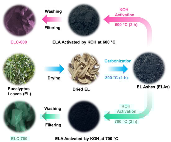 Figure 1 illustrates the schematic process for synthesizing ELC nanosheets. Biomass eucalyptus leaves (EL) were collected from Tholudur, Tamil Nadu, India, and served as the carbonaceous precursor. Initially, the EL was washed with deionized (DI) water and air-dried for five days. Then, the parched ELs were carbonized at 300 °C for 60 min in a muffle furnace to produce carbonized ashes (ELAs). After carbonization, the ELA-KOH mixture was prepared using ELA (4 g) and KOH (16 g) in a mortar. Next, the prepared mixture was stimulated at two various temperatures (600 and 700 °C) for 120 min in an air atmosphere. During the KOH activation, oxygen- and carbon-containing groups react with KOH; then, carbonaceous chemicals (e.g., carbon monoxide (CO), potassium carbonate (K2CO3), etc.) are formed. The activation process was carried out at high temperatures and is illustrated by the following chemical reactions [57,58]: